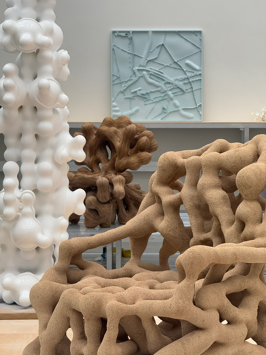 Ein Materialarchiv gab es im Kellergeschoss auch; es war voll von organischen Pilzen, die sich dreidimensional im Substrat ausdehnten. Die obskuren Formen wandelten mithilfe von Enzymen totes organisches Material in nutzbare Energiebausteine um. Blaue und silberne Rosenseitlinge standen wie römische Skulpturen in einer Säulenhalle herum, die mit ihrer weitgespannten Vernunft meinen Träumen Natürlichkeit verliehen.